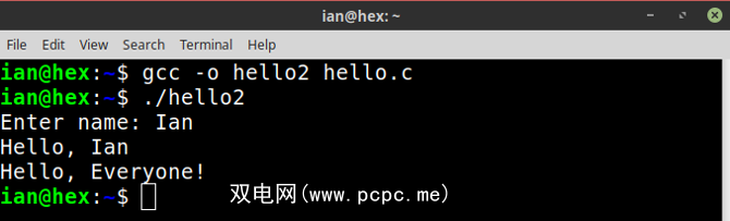 int main(void){ char name[20]; printf("Enter name: "); scanf("%s", name); print_for_me(name); print_for_me("Everyone!"); return 0;}main的第一行创建一个字符数组,该数组包含20个可能的名为name的空格。接下来,提示用户使用printf输入他们的姓名。下一行使用名为 scanf 的新功能,该功能接受用户键入的下一个单词。