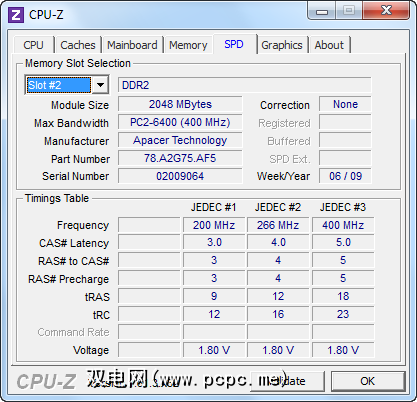 “ SPD"选项卡还列出了每个DIMM的最大带宽,所以现在我知道我的512MB DIMM正在减慢所有速度,因为它是333MHz,而我的2GB DIMM却能达到400MHz。差别不大,但还是很高兴知道,较小的DIMM也使速度变慢。另外,如果您的RAM给您带来麻烦,则可以查看其序列号和生产日期(星期和年份)以及制造商。