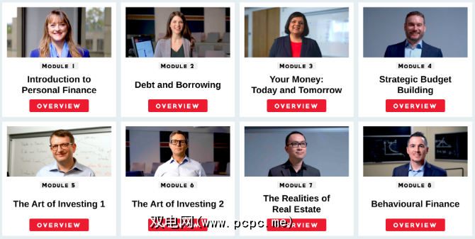 该课程分为八个模块:介绍,债务和借款,您的资金,战略预算制定,投资(两部分),房地产和行为金融。每个模块的长度约为20分钟,然后进行复习测试。所有课程和测试都可以免费在线免费获得。