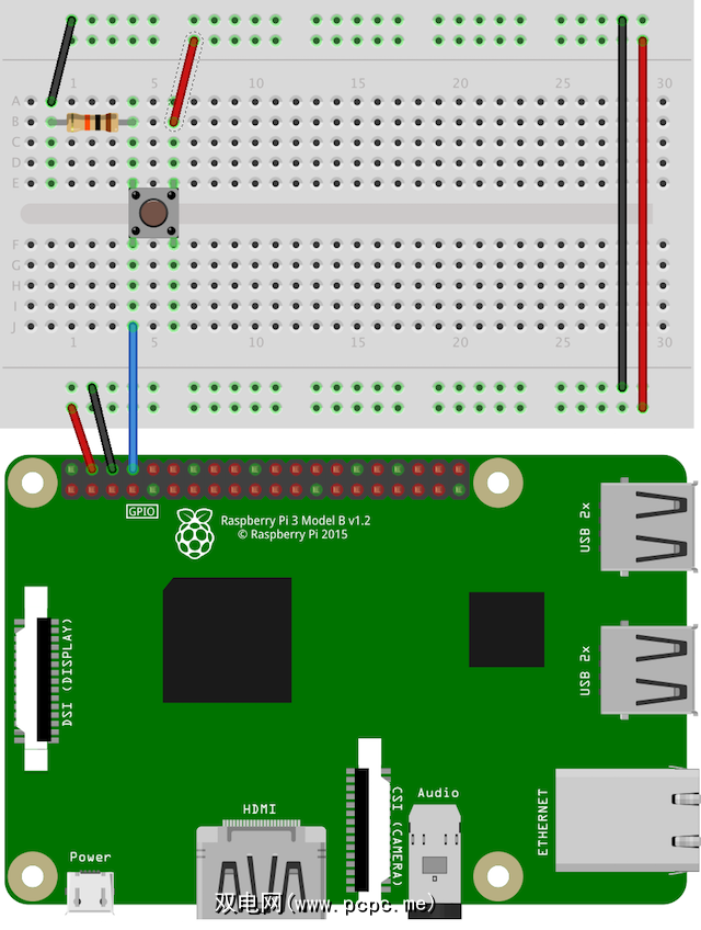 该电阻器称为“下拉"电阻器。这有助于确保Pi认为被按下的按钮,实际上是被按下的按钮。您不必使用它,但是建议您使用它,因为如果没有它,您可能会发现很多噪音和错误的读数。