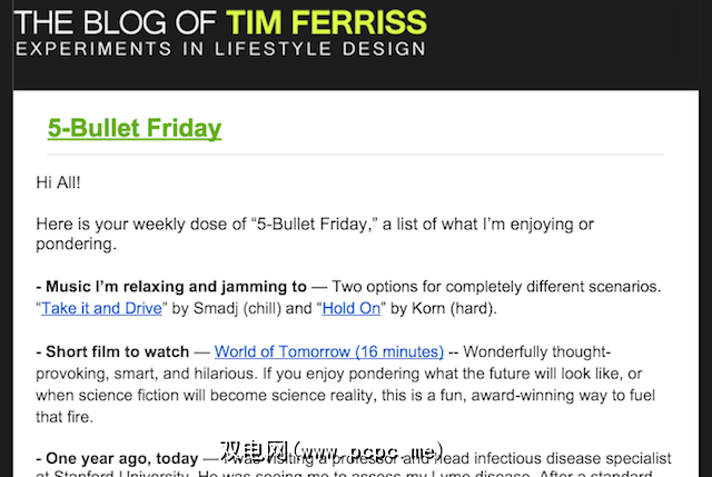 Tim Ferriss在三本畅销书之后,对任何人都不陌生-《四个小时的工作周》 ,四小时厨师长和四小时身体。现在,他有一个非常受欢迎的博客和播客,在他经常发送的电子邮件新闻通讯中对此进行了总结。