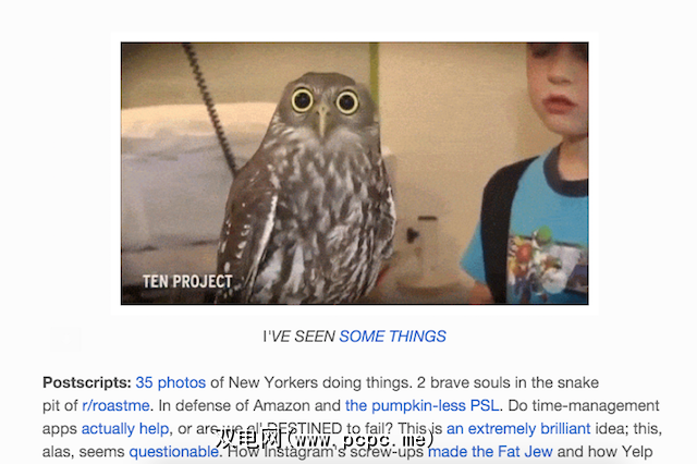 我绝对喜欢这个标题,正是这个标题使我打开了它首先。它只是显示了对新闻通讯,电子邮件或文章的标题的作用。该通讯由《华盛顿邮报》的凯特琳·杜威(Caitlin Dewey)策划,其中包含她的数字化发现(毕竟,她是《邮报》的“数字文化评论家",您认为这是一项相当安全的工作,但尽管如此,她似乎已经成为了敌人)。
