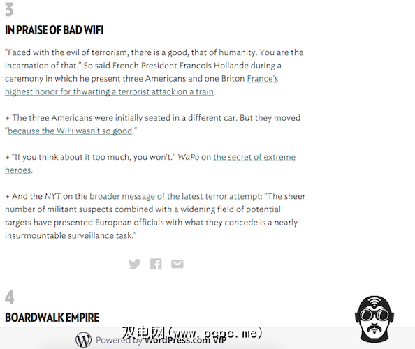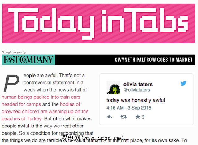“今天在标签页中"是我的另一个最爱,但是必须警告您,该新闻稿非常实用完整的链接(指向相关文章,但仍有很多点击)。另外Rusty Foster倾向于从一个对象迅速跳到另一个对象,直到您的头部旋转。但是,尽管如此,我总是能从他发送的邮件中获悉和娱乐,这是对您收件箱的极大补充。