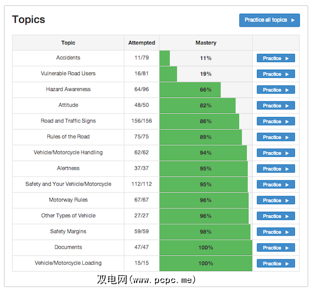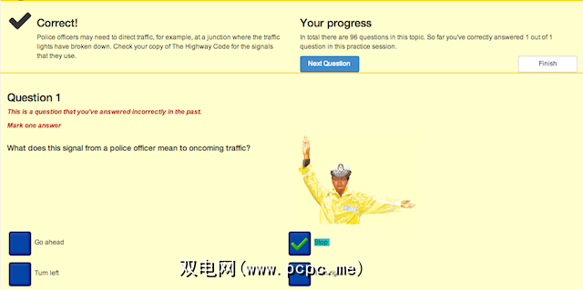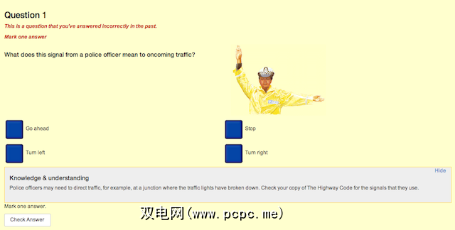您可以解决这些问题,逐步建立自己的知识。每个问题的信息和提示显示在页面底部。这很关键,因为它实际上使您为理解而努力。值得注意的是,我使用的问题是针对B类驾驶考试的。基本上就是汽车。虽然我承认我还没有尝试过,但Theory Test Pro还支持HGV和摩托车测试。