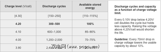 每减少0.10V /电池,充电次数将使放电周期增加一倍,直到达到最佳水平:3.90V / cell,放电周期为2400-4000次。