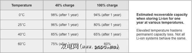 电池大学的研究表明,如果电池在40度时充满40%的电荷,一年后其容量会下降到85%。