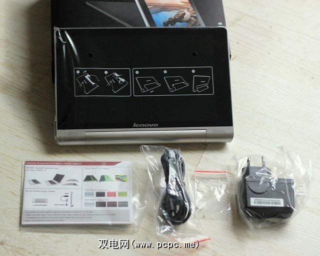 正如我已经提到的,Yoga Tablet的独特之处在于它不寻常的设计。这是它的主要卖点,在打开包装盒之前很难错过。数位板随附标准价格:壁式充电器,微型USB电缆和一些小册子。它也带有两个小贴纸,我相信这些贴纸是用于支架的。