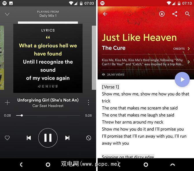 在撰写本文时,Android Spotify应用尚未完全支持歌曲歌词。对于一些精选曲目和专辑,它确实为您提供了Genius服务提供的歌词和琐事。名为 Behind the Lyrics (在歌词后面),只要有可用,它就会在“正在播放"屏幕上的专辑封面顶部弹出。