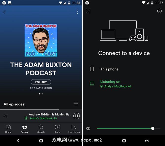 Android应用程序还可用于收听台式机应用程序中的播客,这是您通常无法做到的。在手机上加载节目,然后点击连接到设备按钮并选择您的计算机(您还需要在该计算机上安装并运行Spotify)。
