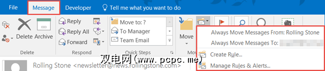 如果打开了一条消息,则当您在上时会在顶部看到规则。消息标签。当您单击规则时,您可以快速选择当前显示的消息,以将始终从该发件人发送或专门发送给您的电子邮件发送到某个文件夹。您还可以选择创建规则或管理规则和警报。