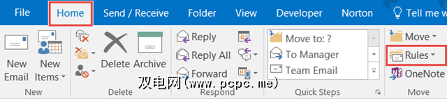 如果您在桌面上使用Outlook 2016,则当您在桌面上使用规则时,会在移动部分的顶部看到规则在主页标签上。