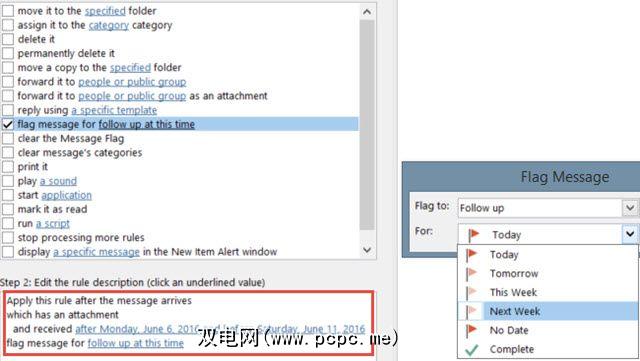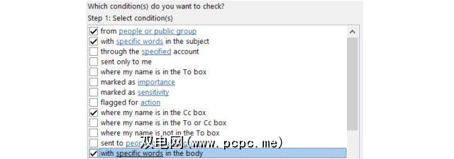 使用复选框标记所需的条件。标记每个标记后,它将显示在其下方的“步骤2"框中。在该步骤2区域中,您将使用链接来指定参数。
