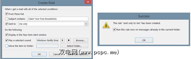 完成后,单击确定。确认窗口将允许您在当前文件夹中的消息上选中一个框以运行该规则,这对于处理规则所适用的大量消息非常方便。您还可以选择高级选项按钮以获取更多参数,如下所述。