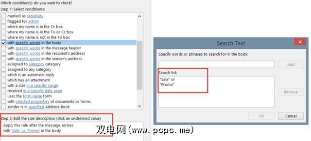 例如,如果您选择使用消息中的某些单词来应用规则,则将单击特定于术语的单词,然后在下一个窗口中输入。点击添加,您要应用的所有单词或短语将显示在其下方的框中。单击确定,然后这些单词或短语将替换步骤2中的特定单词。