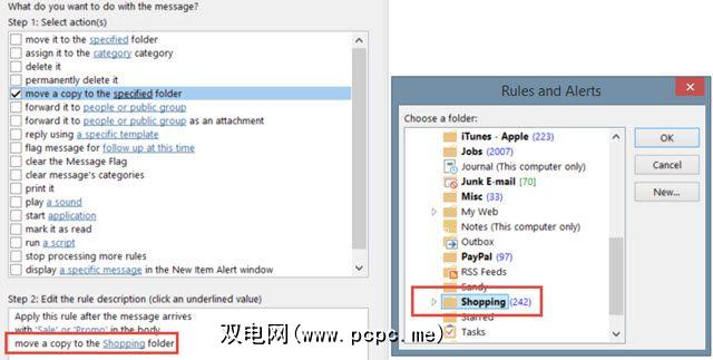 Click Next and add the actions that should apply to your rule. Here again, you can choose more than one and configure the parameters in the Step 2 box if applicable. For instance, if you have chosen to move a copy of the email to a folder, click specific folder to make your selection. Click OK and the item chosen will pop into the Step 2 box.