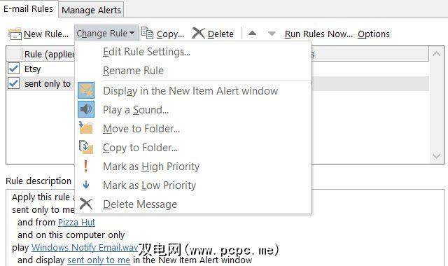 在桌面版Outlook中,从菜单中单击规则,然后选择 Manage Rule&Alerts 。该窗口将显示您已设置的所有活动规则。您可以创建新规则或编辑当前规则,复制或删除规则,然后在特定文件夹或收件箱中运行所有规则。如果选择选项,则还可以轻松导出或导入规则。
