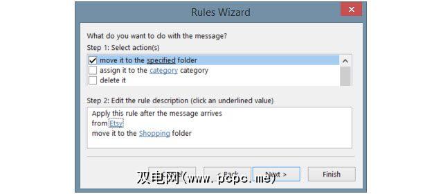 您可以通过以下方式为规则选择更多选项: 下一步,如果完成,只需单击完成。为您的规则命名,可以选择在收件箱中运行它,并确保选中了打开规则的复选框。单击完成,就一切就绪。