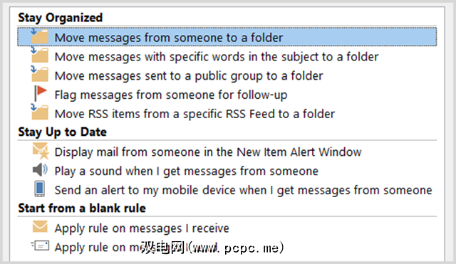 在这两种方式中和个人情况,Outlook中的规则可以有效地组织您的邮件,并使您在重要事项上保持最新。以下是一些您可能会涉及的基本示例。