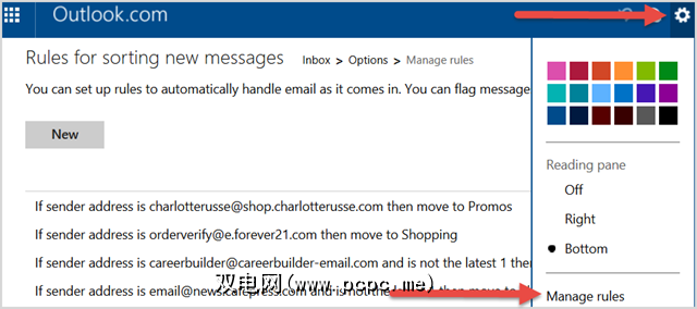 如果是Outlook的在线版本,则单击顶部的齿轮图标,选择管理规则,您将看到所有当前规则的列表。然后,您可以选择排序,删除或编辑它们。