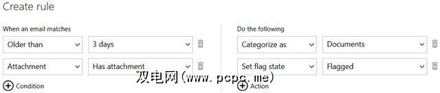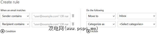 在Outlook.com上,单击齿轮图标,选择管理规则,然后单击新建按钮。您将使用与上面针对台式机版本所述的相同类型的条件和操作,但是选项受到更多限制。