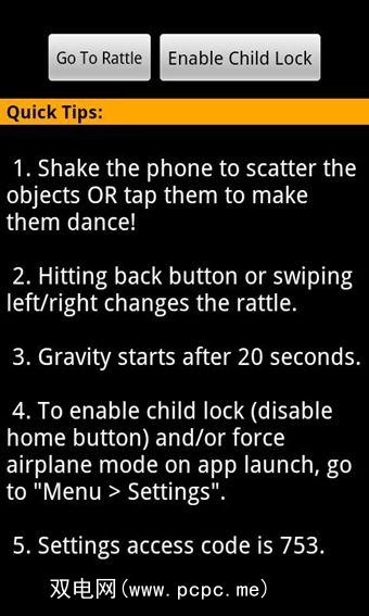 当您首次安装并启动Baby Rattle时,该应用将指导您启用儿童锁功能。您只需要执行一次。下次加载该应用程序时,该应用程序将被锁定。您还可以决定放弃儿童锁选项。
