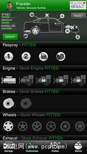 启动该应用程序,您将看到当前的车辆以及统计数据和可用的升级。您几乎可以在这里自定义任何内容,从油漆到车轮甚至车牌。一起完成一个自定义任务并点击 Order 按钮将更改发送到游戏。