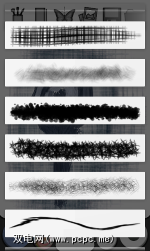 Infinite Painter提供了二十种不同的选择您可以选择自然媒体画笔来获得所需的外观。有些工具(如上面的屏幕截图中首先出现的交叉阴影线笔刷)可以很好地用于阴影或大面积填充。其他选项更适合进行细节工作,尤其是与Infinite Painter的“捏到缩放"控件结合使用时: