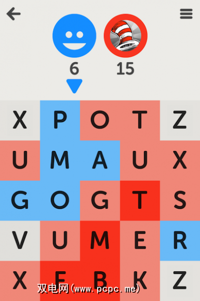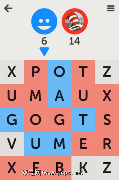 轮流创建单词时,您使用的每个图块都会以颜色(蓝色)着色。如果您的对手在下一回合使用相同的方块,则其颜色将再次改变,这次变为粉红色。