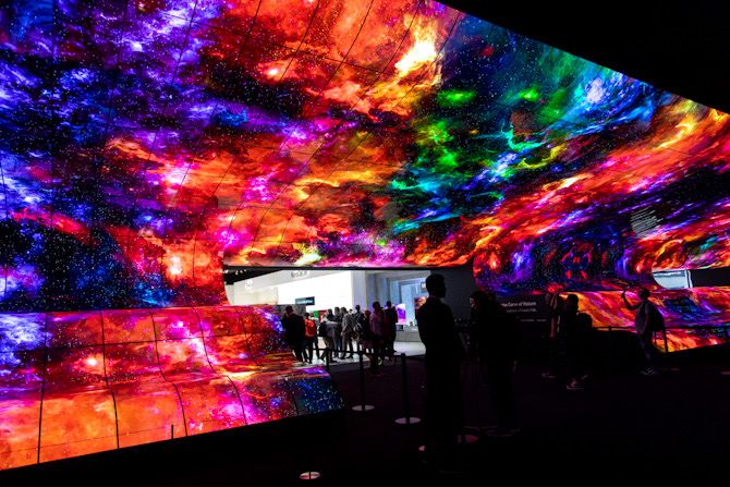 LG的OLED体验是与众不同的沉浸式体验。 OLED面板覆盖弯曲的墙壁和天花板。镜子使房间看起来无穷无尽,环绕声扬声器技术带来了一点电影般的魔力。这是电影或广告的未来吗?逼真的逼真的色彩模仿丛林,海洋或星际冒险。