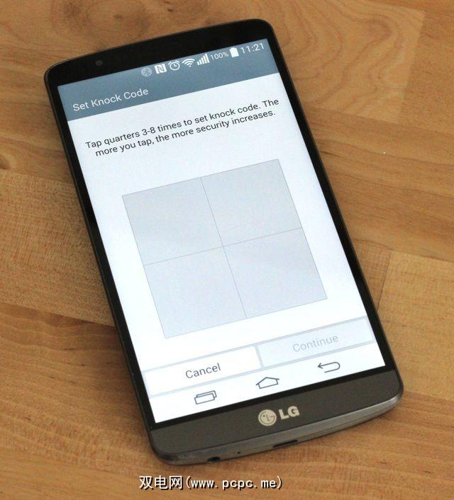 这就是Knock Code出现的地方。G3最著名的功能之一是,敲门代码将手机的大屏幕分为四个象限。在屏幕关闭的情况下,点按一个只有您知道的密码(右上,右下,右下),然后电话才会解锁。您的代码可以长达八次敲门,并且可以正常工作。