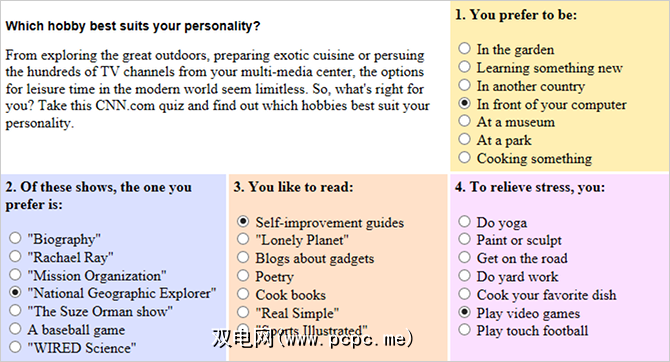 CNN的爱好测验 —一个非常简单的(也许甚至是傻傻的)测验,问你15多项选择题。答案将告诉您最喜欢的七种兴趣类型:创意,发现,食物,家庭,户外,科技,旅行。结果包括一些建议,例如发现类型的以下示例:考古挖掘,植物学,股票市场,冥想等。