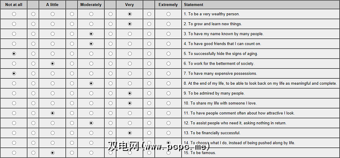 个性实验室的生活目标测试 —该参与测试旨在评估您在六个不同人生目标上的关系和看法:财务成功,社会认可,吸引力,隶属关系,社区参与和自我接纳。了解哪个人生目标最重要,可以帮助您决定应该在哪些领域投入精力。