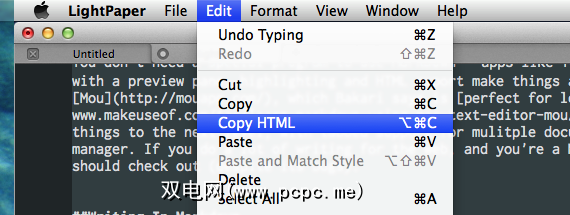 完成章节后,您可以将其复制为HTML:该选项和keyboarld快捷方式都可以在 Edit 菜单中找到。