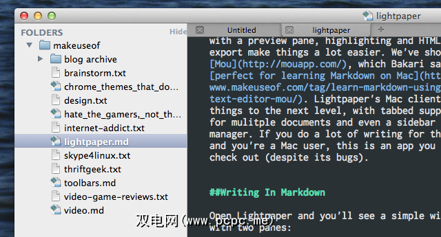Lightpaper的Mac免费客户端[不再可用]将功能提升到了一个新的高度,对多种文档甚至选项卡的选项卡式支持侧边栏文件管理器。如果您为Web编写了大量文章,并且您是Mac用户,则应该检出该应用程序(尽管存在bug)。