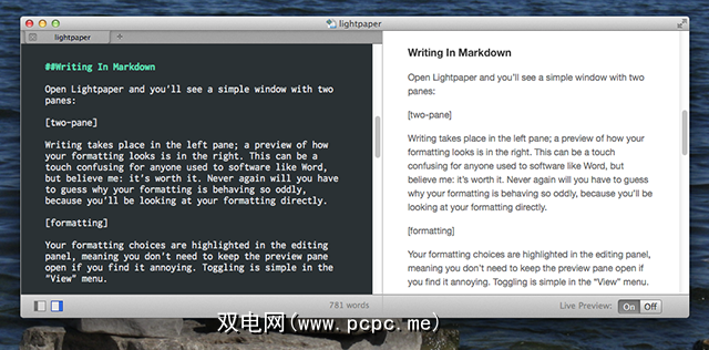 写操作在左侧窗格中进行;右侧是格式外观的预览。您在左侧所做的更改将迅速显示在右侧(您可以选择关闭自动更新)。这会让使用过Word之类软件的人感到困惑,但请相信我:这是值得的。您再也不需要猜测为什么格式化会如此奇怪,因为您将直接查看格式。