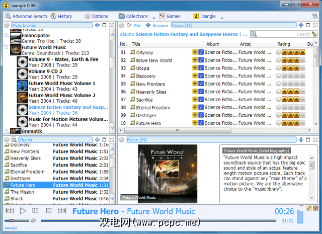多个窗格。您可以启用或禁用七个不同的选项。界面中的窗格。您必须相对于当前窗格添加新窗格,这就是为什么布局设置可能难以正确设置的原因,但是这里的灵活性很高。多个收藏夹。 Jaangle是少数可以处理多个收藏夹的音乐播放器之一。通常,您会将整个音乐库分成不同的播放列表,但是Jaangle允许您将一个库(或多个库)细分为收藏,然后可以彼此独立浏览。信息检索。对于数据不完整的音乐文件,Jaangle可以自动从Amazon(专辑封面和专辑评论),Last.FM(专辑封面,歌手简介,歌手照片)和Google(歌曲歌词)中提取信息。 li>标签编辑器。 Jaangle没有最复杂的标签编辑器-实际上,它比普通的音乐播放器更基本-但是它确实有一个可以用来管理您的图书馆。如果您需要更高级的工具,请查看以下音乐库管理工具之一。全局热键。即使Jaangle不是焦点窗口,也可以控制音乐。全局热键非常方便,以至于如今不使用它们就很麻烦。幸运的是,它们在这里可用并且非常有用。可视化。 Jaangle利用Winamp的AVS系统创建了引人注目的可视化。该程序附带了一些默认值,但您也可以通过编写自己的AVS可视化脚本或从Web上下载它们来添加更多内容。皮肤。拥有数十种不同的配色方案以及编辑或创建自己的功能。进行设置非常容易,以使Jaangle与您的操作系统其余部分的颜色保持一致。迷你播放器。在这些情况下,您无需管理或浏览高级功能