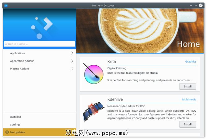 Discover是KDE Plasma桌面环境对应用商店问题的解答。核心概念是相同的。发现是查找和管理软件的地方。检查侧边栏以搜索您知道的应用程序,并浏览那些您不熟悉的应用程序。