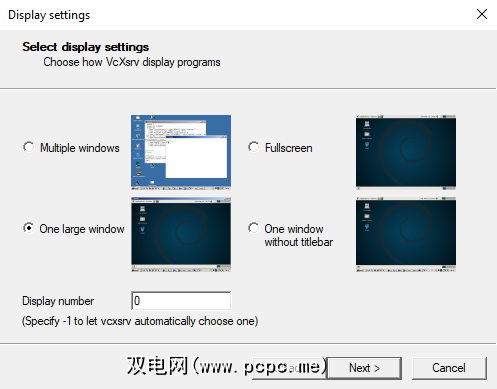 我们使用了具有XLaunch工具的VcXsrv。单击此按钮以查看 X显示设置窗口,然后选择一个大窗口或一个没有标题栏的大窗口。在其中找到显示编号,并将其设置为 0 。
