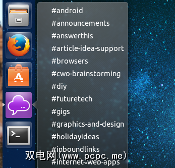 Ubuntu的一个被忽略的功能是停靠菜单。 ,您可以通过右键单击停靠栏中的任何图标来查看。从这里,Scudcloud提供了一种快速打开您订阅的频道的快速方法: