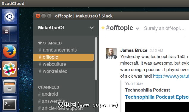 似乎Windows客户端正在使用中,Linux用户正在使用中。同时,Mac Slack客户端与系统集成良好,提供了本机通知等。 ScudCloud是一个非官方的应用程序,可以为Ubuntu用户提供相同的功能–外观如下。