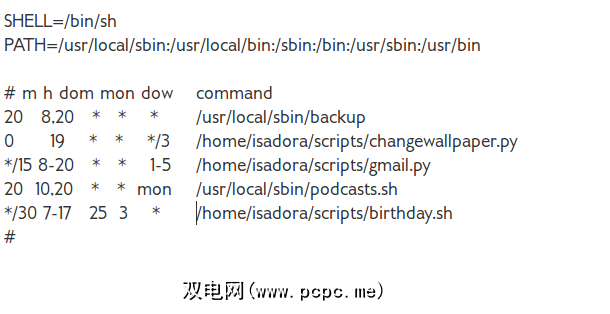在此示例中,我们计划每天在08:20和20:20进行备份。墙纸每三天在19:00自动更改一次,并且脚本将在每个星期一10:20和20:20检查新的播客。生日提醒设置为3月25日,每30分钟在指定的时间范围内运行一次。最后,脚本会每15分钟从8点到20点(仅在工作日)检查一次电子邮件。您可以自由地在列之间使用空格和制表符来组织crontab,但不要在列中使用空格和制表符(不要在逗号,连字符和斜杠之间放置空格)。