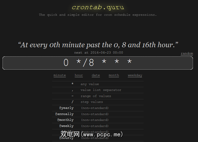 如果这听起来太复杂,请不要不必担心-您可以始终依靠互联网。诸如Crontab Generator,Crontab.guru和Corntab之类的工具可帮助您创建cron作业,而无需了解任何crontab语法。它们向您显示下一步何时执行作业,并提供常用表达式的模板。 Crontab.guru是同类产品中最好的,因为它可以对crontab语法进行实时测试,因此您可以立即查看所做的更改将如何影响计划。