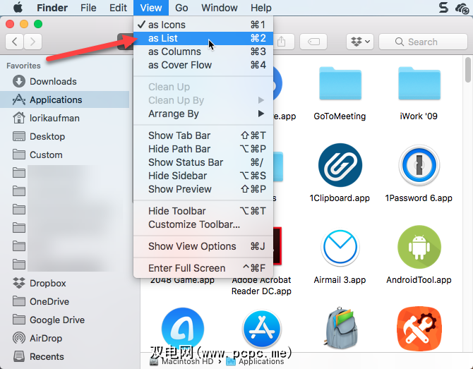 如果您当前未以列表形式查看“应用程序"文件夹的内容,按 Cmd + 2 ,或转到“查看">“列表" 。