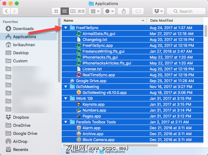展开所有所需的文件夹后,按 Cmd + A 以选择“应用程序"文件夹中的所有项目。然后按 Cmd + C 复制列表。