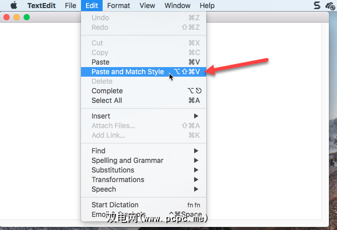在TextEdit中打开一个新文档。然后转到编辑>粘贴和匹配样式,或点击 Cmd + Option + Shift + V 。