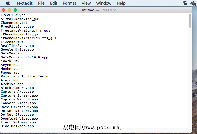 Finder的“应用程序"文件夹中的所有应用程序,包括扩展文件夹中的应用程序,均粘贴到TextEdit文件中。子文件夹中的某些文件可能不是应用程序。您可以浏览列表并删除所有以 .app 结尾的文件。