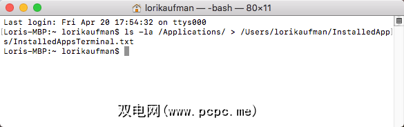 ls -la /Applications/ > /Users/[USERNAME]/InstalledApps/InstalledAppsTerminal.txt这将生成Applications文件夹的详细目录列表并将其写入文本文件在指定的路径。确保将 USERNAME 替换为您的用户名,并根据需要随意更改路径和文件名。