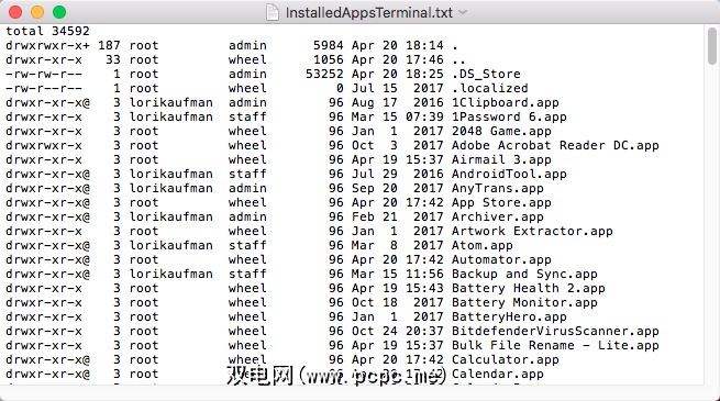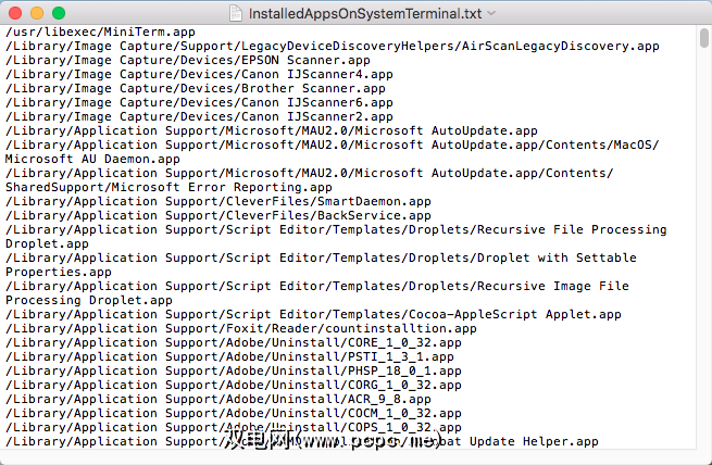 搜索结果在“终端"窗口中列出。我试图将结果重定向到文本文件,但是此命令不起作用。但是,您可以轻松选择APP文件列表并进行复制( Cmd + C )。然后,您可以将其粘贴到TextEdit或其他文档应用程序中的文档中,然后保存列表。
