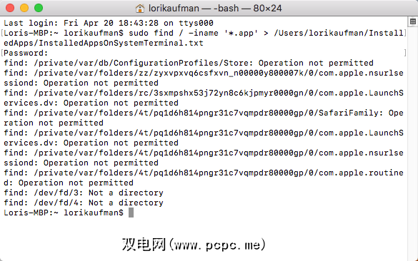 sudo find / -iname '*.app' > /Users/[USERNAME]/InstalledApps/InstalledAppsOnSystemTerminal.txt这会找到系统上的任何 APP 文件,忽略大小写( -iname ),然后发送结果到指定的文本文件。请记住,用您的用户名替换 USERNAME ,并更改路径和文件名。