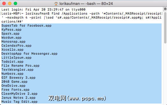 find /Applications -path '*Contents/_MASReceipt/receipt' -maxdepth 4 -print |\sed 's#.app/Contents/_MASReceipt/receipt#.app#g; s#/Applications/##'此命令在“应用程序"文件夹中查找,然后进入每个应用程序的 receipts 文件夹(位于每个应用程序的包装内容中),以查看哪些应用程序具有来自Mac App Store的收据。希望您没有购买任何浪费金钱的应用程序。
